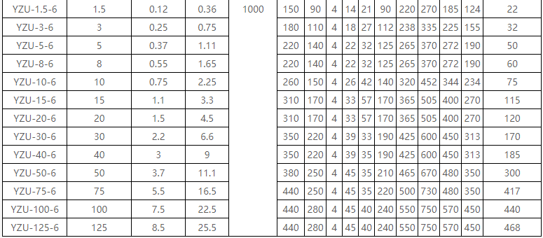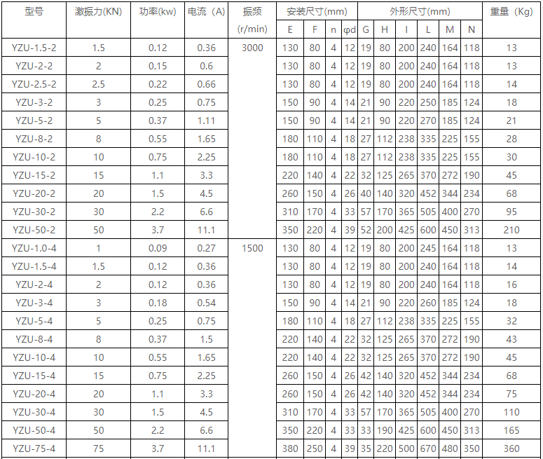YZU系列振動(dòng)電機(jī)相關(guān)技術(shù)參數(shù):